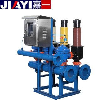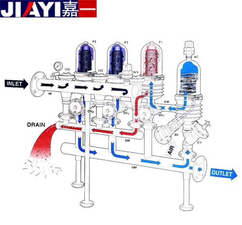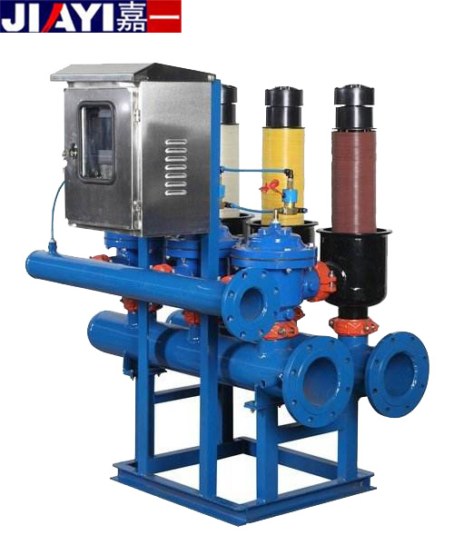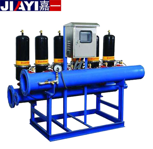 全自動盤式過濾器盤片在單元內為緊密壓實疊加在一起,上下兩層盤片中間溝槽起到過濾攔截的作用。屬于自清洗過濾器的一種,采用多項專利技術,安裝使用更加安全、高效,節水、省地、日常維護少。濾芯無彈簧設計,過濾時巧妙利用來水壓力壓緊盤片組,使得反洗的壓力要求大大降低。獨特的內置鴨嘴閥,保證濾芯在過濾時的大出水量,同時反洗時起到很好的逆止功能。分體組裝式的濾芯骨架,可根據設計要求靈活調整濾芯高度,達到調整過濾面積的作用,滿足不同的系統配套要求。拋棄了常用的金屬卡箍設計,過濾單元采用自鎖卡扣配合特殊設計的密封圈,過濾單元外殼的安裝拆卸簡單容易,密封效果好。每個過濾單元均配有過濾和反洗狀態指示裝置及自動排氣裝置,在避免水錘破壞的同時還可以提高濾芯的反洗效果。原水通過過濾單元時由外向內流動,大于溝槽的雜質會被攔截在外部。全自動盤式過濾器的核心部件是疊放在一起的塑料濾盤,濾盤上有特制的溝槽或棱,相鄰濾盤上的溝槽或棱構成一定尺寸的通道,粒徑大于通道尺寸的懸浮物均被攔截下來,達到過濾效果。該產品在很大程度上可以取代砂濾器等傳統的機械過濾裝置,其性能優越、水電耗遠低于其他產品。