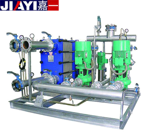板式換熱機組,為換熱機組的一種型號,其特點是采用板式換熱器,在相同壓力損失情況下,其傳熱系數比管式換熱器高3-5倍,占地面積為管式換熱器的三分之一,熱回收率高。設備由板式換熱器、智能溫控裝置、智能電控裝置、循環泵、補水泵、穩壓膨脹水箱、補(凝)水箱、過濾器、閥門、儀表、傳感器、配管底座等組成。