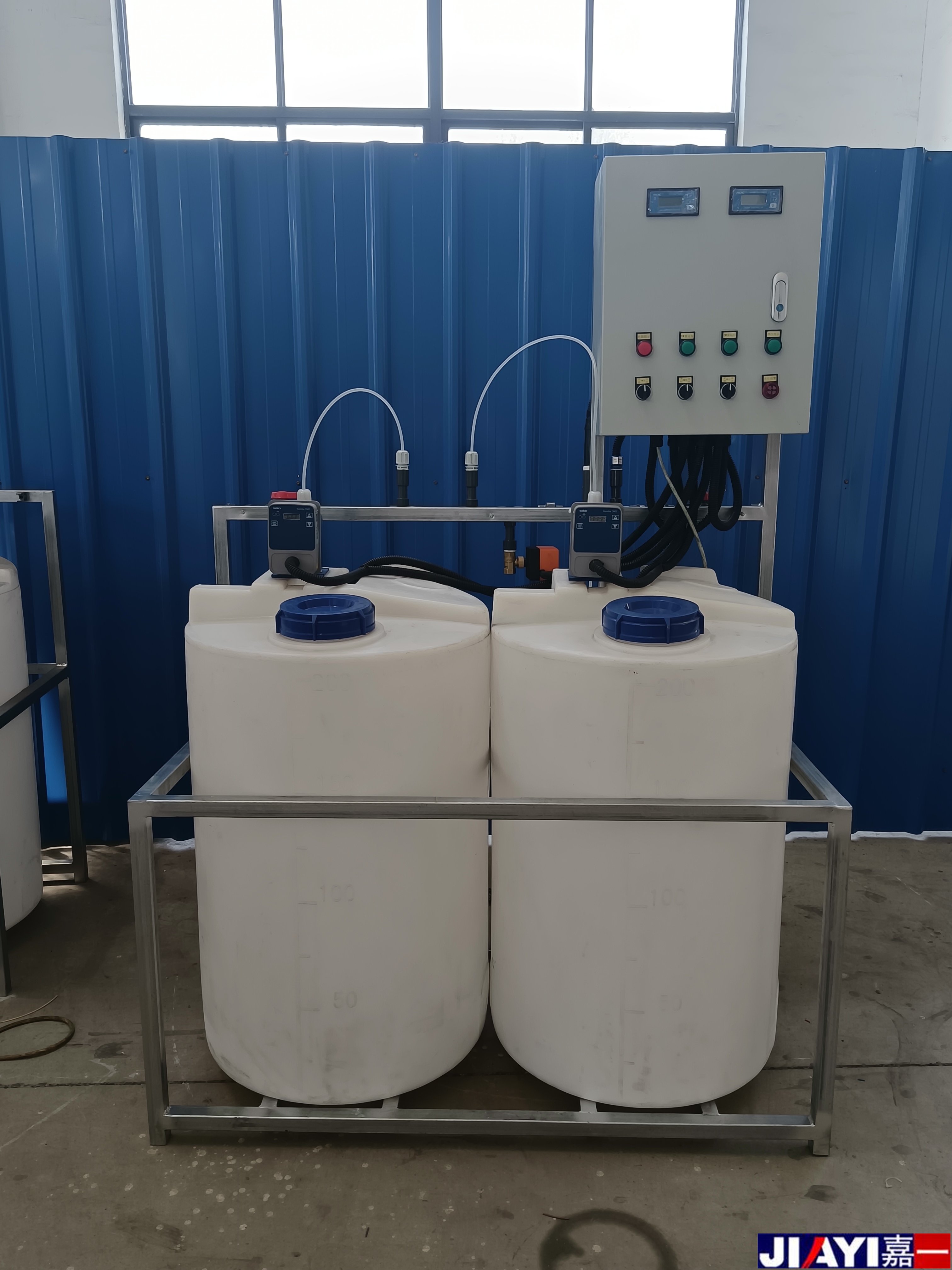 全自動加藥裝置采用時間程序控制,此控制方式無需儀表的支持,首先根據系統的運轉需要設定自動加藥的周期、加藥量、加藥時間和加藥頻率。在以后的系統運轉過程中,到加藥周期,計量泵自動打開加藥,加到規定的時間計量泵關閉;到排污周期,計量泵停止加藥,排到規定的時間后,計量泵繼續開啟,補充排污損失掉的藥劑,把系統的含藥量維持在正常的水平、加到規定的時間計量泵關閉。