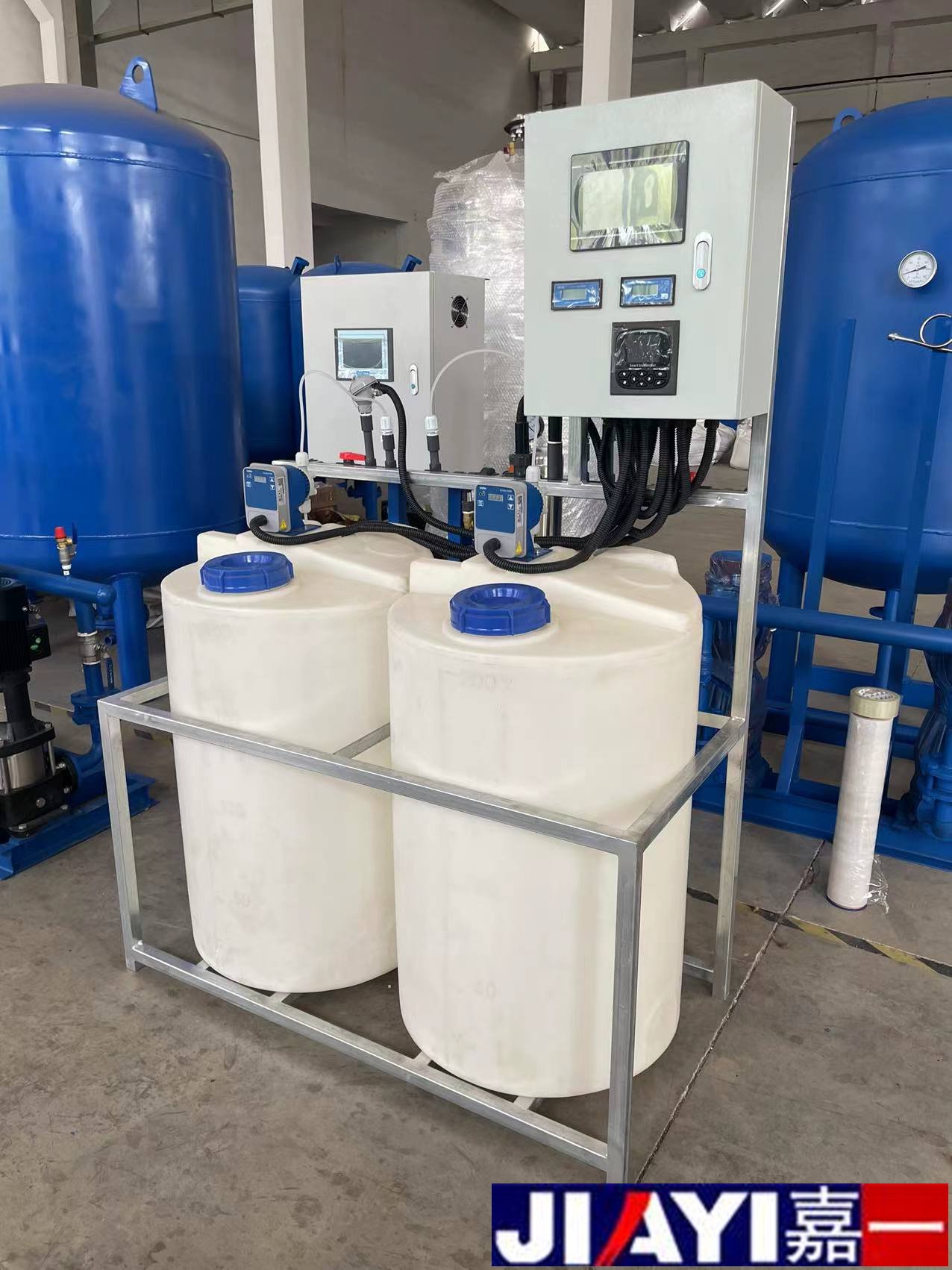 全自動加藥裝置采用時間程序控制,此控制方式無需儀表的支持,首先根據系統的運轉需要設定自動加藥的周期、加藥量、加藥時間和加藥頻率。在以后的系統運轉過程中,到加藥周期,計量泵自動打開加藥,加到規定的時間計量泵關閉;到排污周期,計量泵停止加藥,排到規定的時間后,計量泵繼續開啟,補充排污損失掉的藥劑,把系統的含藥量維持在正常的水平、加到規定的時間計量泵關閉。